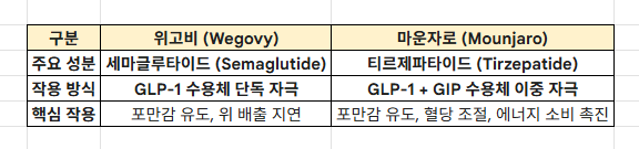 두 약물은 모두 GLP-1 을 모방한다는 공통점이 있지만, 사용하는 성분에 따라 효과와 작용 방식에 미묘한 차이가 있습니다. 아래에 표로 정리를 해두었는데요, 가장 큰 차이는 마운자로는 GIP 수용체를 이중으로 자극해줍니다.